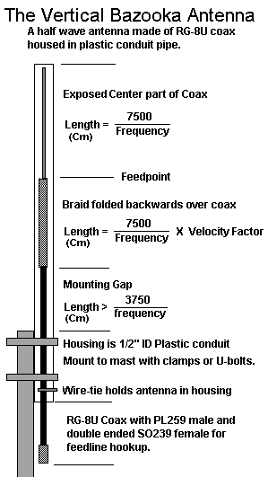 Puede utilizar las fórmulas del diagrama anterior para crear dipolos Vertical Bazooka para cualquier frecuencia. Sin embargo, las consideraciones prácticas de montaje y soporte tienden a limitarlo al rango de 10 metros (28 MHz) a 70 cm (440 MHz). Por debajo de unos 25 MHz, el tubo de la carcasa se alarga mucho y puede resultar difícil de sujetar. Por encima de unos 450 MHz, se sobrepasan los límites de frecuencia del cable coaxial, que se ven afectados por la sección inferior de la malla del dipolo.