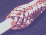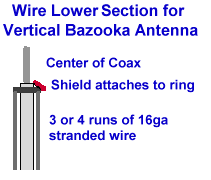 En esta modificación, se reemplaza la sección de blindaje con 3 o 4 tramos de cable de lámpara aislado de calibre 16. Para ello, corte la malla y gírela para formar un trozo corto para soldar. Haga un anillo de cable que rodee el cable coaxial, fije los cables al anillo y suelde a la malla de blindaje. Los cables se fijan a los lados del cable coaxial con tubo termorretráctil. Para ajustar esta nueva sección inferior, corte trozos de los extremos de los cables. Esta modificación tiene la ventaja de que aún puede enrollar la antena, si se usa como antena de emergencia.