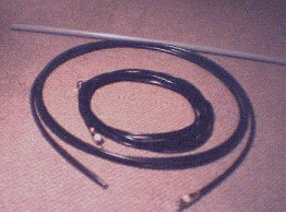 Arriba se ven todas las piezas necesarias para construir una antena vertical Bazooka. El círculo más grande de cable es coaxial RG-8U, que se convertirá en la antena. La bobina interior es mi línea de alimentación, compuesta por 4 longitudes de onda de coaxial RG-8X. En la parte posterior de la imagen se ve el tubo de plástico gris, un trozo de conductor eléctrico que sujetará la antena terminada.