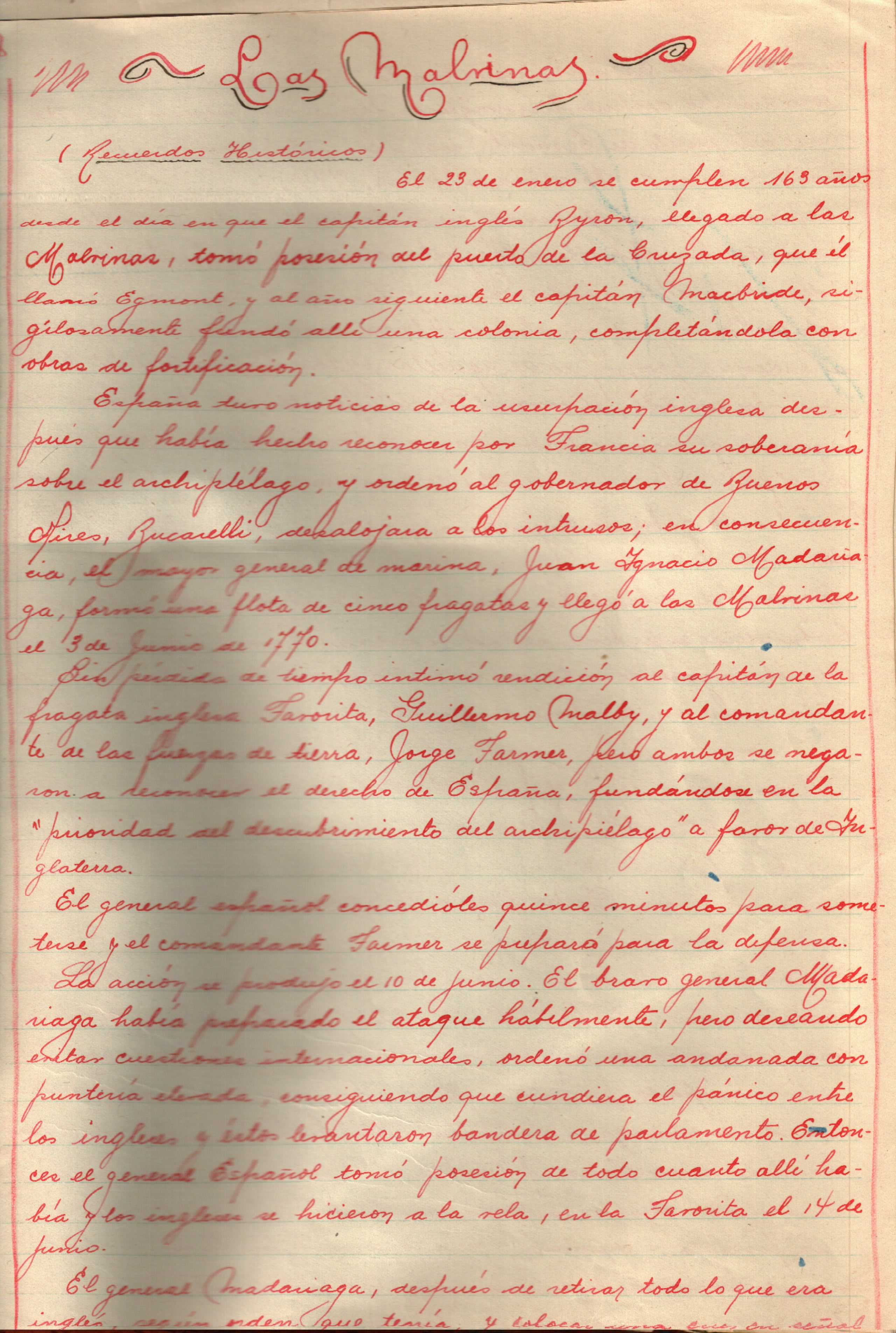"El 23 de enero se cumplen 163 años (en 1929. Hoy se cumplen 260) desde el día en que el capitán inglés Byron, llegado a las Malvinas, tomó posesión del puerto de la Cruzada, que él llamo Egmont y al año siguiente el capitán Macbride, sigilosamente fundó allí una colonia, completándola con obras de fortificación.