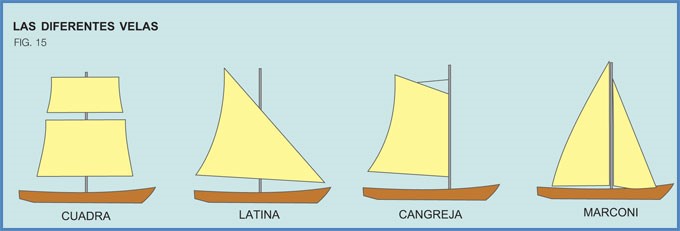 Se conoce como “vela” a una pieza de tela sujeta a un palo, que debidamente colocada y orientada, sirve para propulsar una embarcación utilizando el viento. Las velas fueron evolucionando con el tiempo hasta llegar a la actual vela “Marconi”, utilizada en el moderno aparejo “Sloop” visto con anterioridad. (Fig. 15)