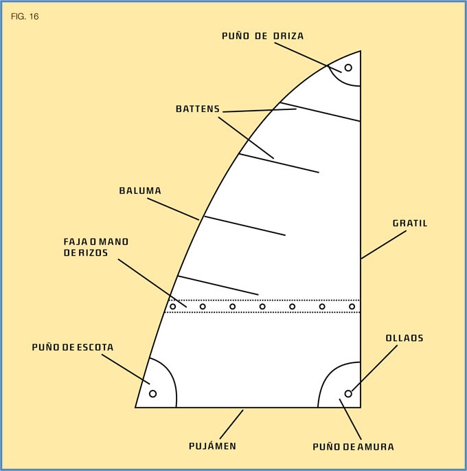 - Rizos: Conjunto de orificios practicados en la vela y que, atravesados por cabos, sirven para reducir la superficie vélica.