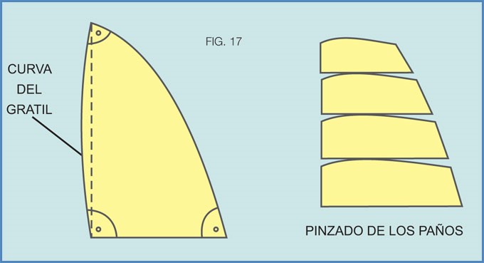 Es muy importante para que una vela tenga buena performance que su “profundidad” sea la adecuada. Esto se lograba al principio construyéndolas con determinada curva en el gratil (una vela con el gratil curvo envergada en un mástil derecho se “pancea” adquiriendo profundidad) (Fig. 17).