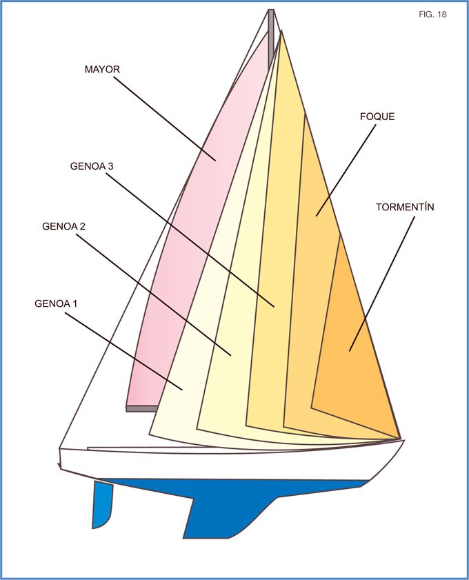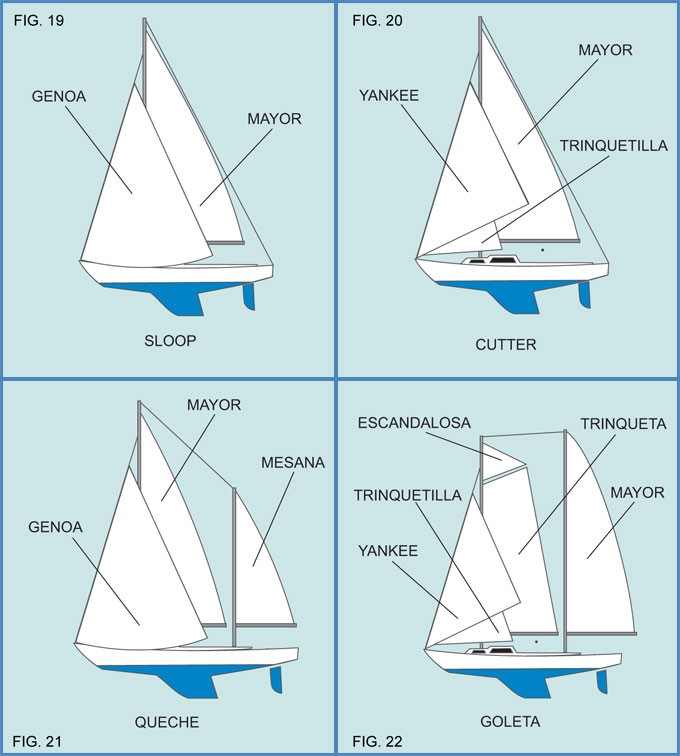 En el tradicional aparejo Sloop (fig. 19), se cuenta con una una vela Mayor y una Genoa como vela de proa. En este caso las velas son de tipo Marconi.